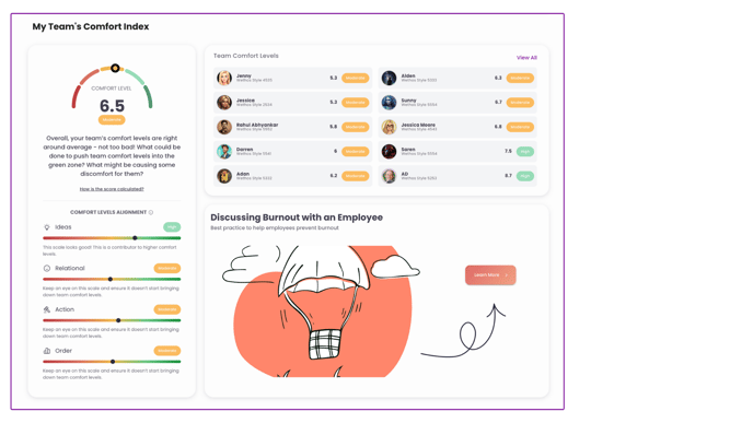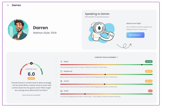 Click on an individual to gain further details about their specific comfort level. We map their comfort across the four scales to better pinpoint where they may not be thriving.