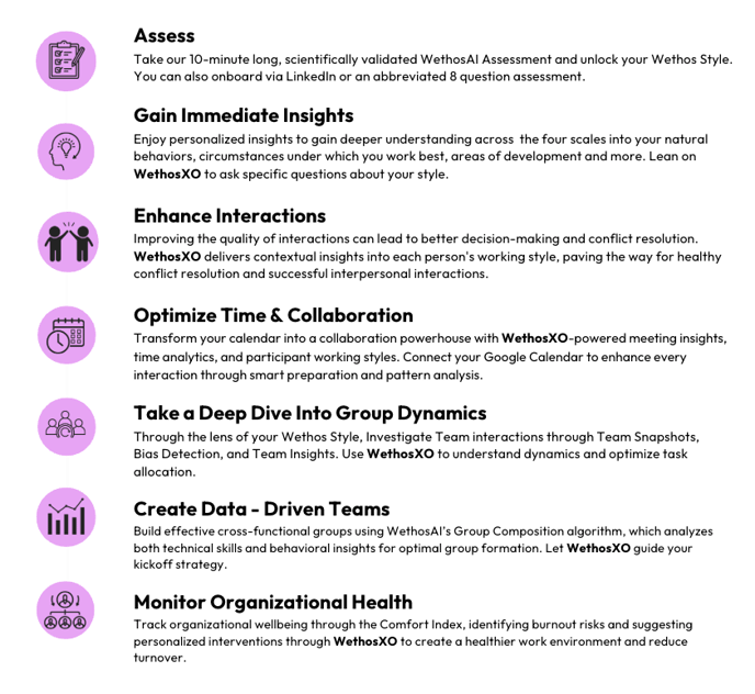 WethosXO is woven throughout the WethosAI Platform from when you complete your assessment through every feature WethosAI provides.