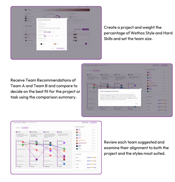 - Receive Team Recommendations of Team A and Team B and compare to decide on the best fit for the project or task using the comparison summary.