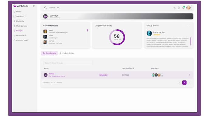 - Review your Cognitive Diversity Score™ to ensure balanced perspectives and be mindful of Groupthink or potential friction points