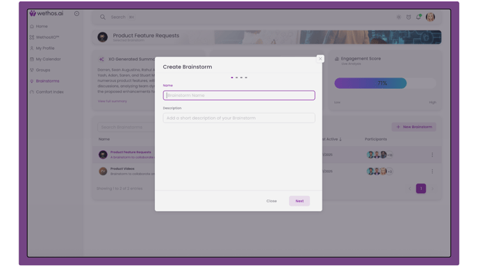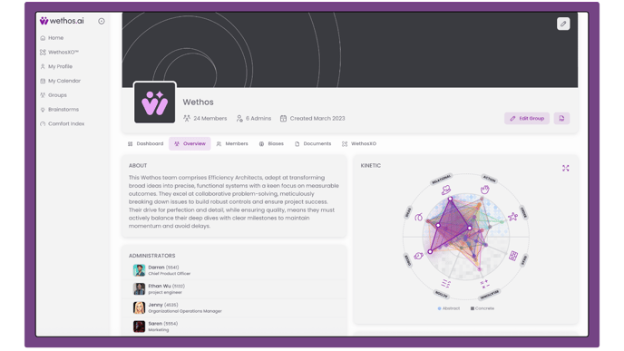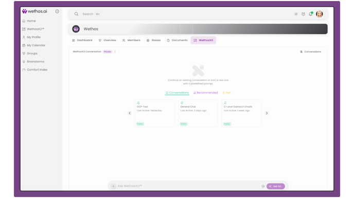 Throughout your journey in both Groups and Brainstorms, you have access to WethosXO™, your trusted AI-powered ally. WethosXO™ tailors advice to the distinct Wethos Styles of you and your team members, offering guidance as you navigate various professional challenges and scenarios.