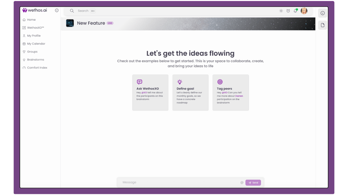 - View starter prompts to help kickstart discussion: - Ask WethosXO questions - Define goals - Tag peers for input